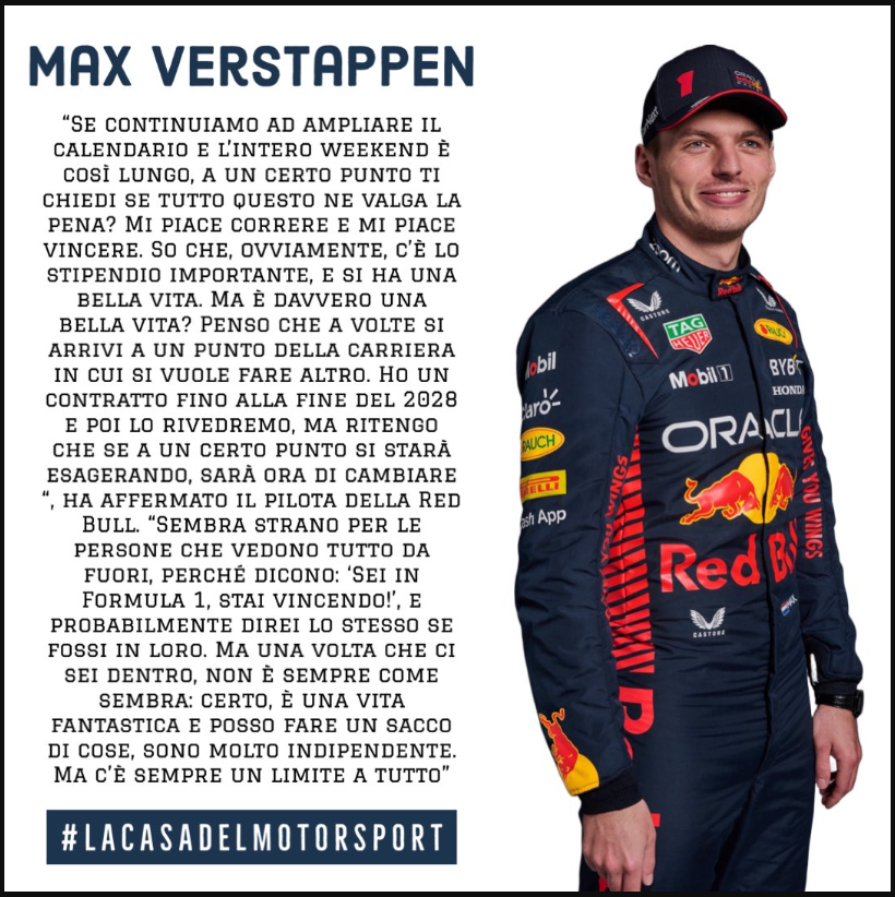 “Se continuiamo ad ampliare il calendario e l’intero weekend è così lungo, ad un certo punto ti chiedi se tutto questo ne valga la pena. Mi piace correre e mi piace vincere. So che, ovviamente, c’è lo stipendio importante, e si ha una bella vita. Ma è davvero una bella vita? Penso che a volte si arrivi a un punto della carriera in cui si vuole fare altro. Ho un contratto fino alla fine del 2028 e poi lo rivedremo, ma ritengo che se a un certo punto si starà esagerando, sarà ora di cambiare”.