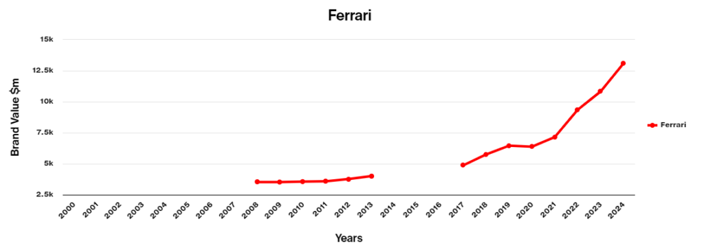 Il grafico qui sotto mostra il trend di crescita del brand Ferrari, dal 2008 ad oggi.