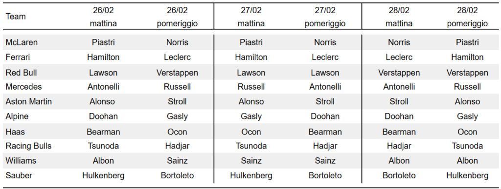 Sul circuito di Sakhir potrà scendere in pista una sola monoposto per ognuno dei 10 team e dunque i 20 piloti titolari dovranno alternarsi durante i tre giorni, avendo a disposizione dodici ore a testa.