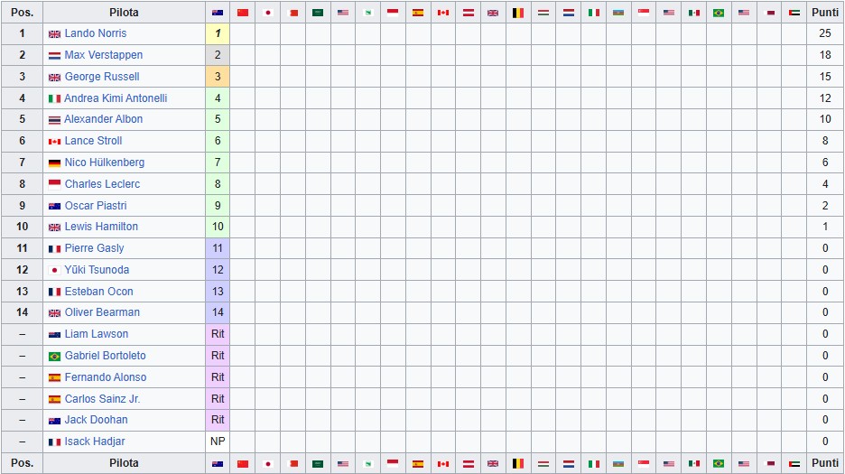 Norris, Verstappen, Russell. E’ questo il podio del primo Gran Premio della stagione 2025 di Formula 1 e sono questi tre piloti ad occupare ovviamente le prime tre posizioni della classfica mondiale piloti. Dopo la gara di Melbourne, alle loro spalle troviamo nell’ordine: Antonelli, Albon, Stroll, Hulkenberg, Leclerc, Piastri e Hamilton.