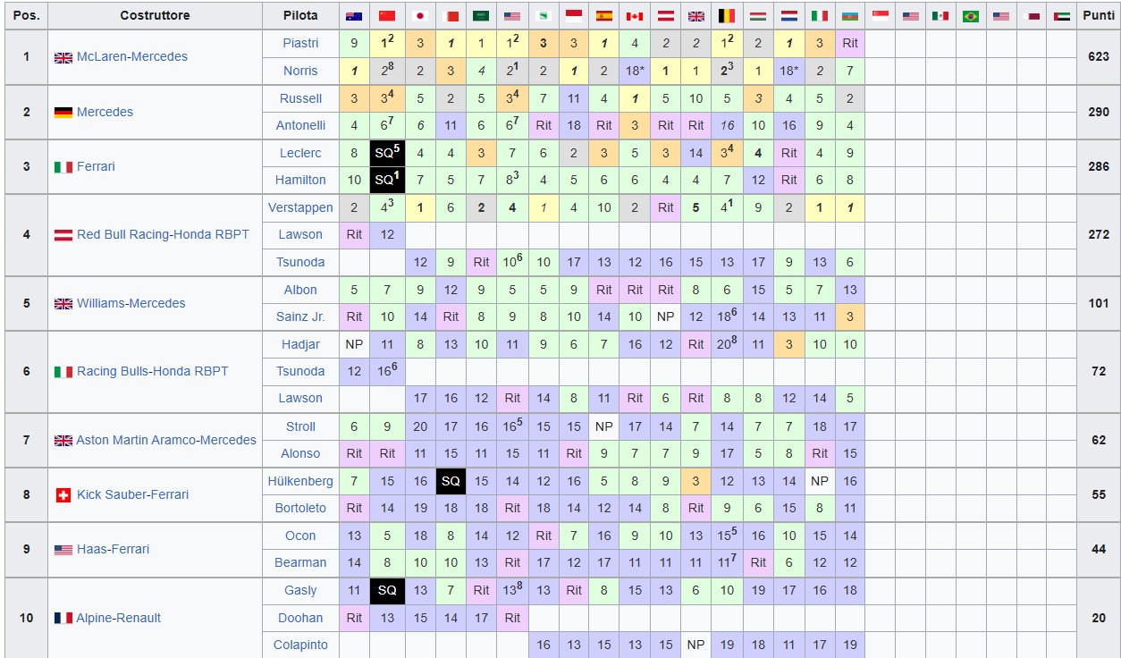 CLASSIFICHE F1 2025: MONDIALE COSTRUTTORI FORMULA 1